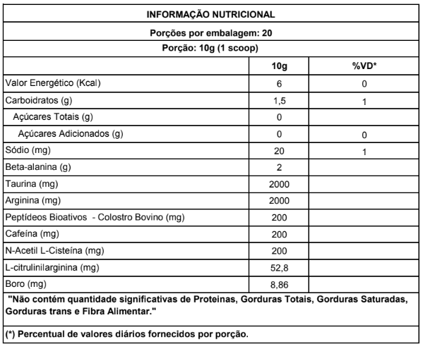 Beta-alanina, Taurina, Arginina, Colostro Bovino Integral (peptídeos bioativos), Alga Chondrus Crispus Invernal (L-citrulinilarginina), N-Acetil L-Cisteína, Cafeína, Tetraborato de sódio decahidratado (Boro), Isomaltulose (PalatinoseTM), Acidulante Ácido Cítrico, Antiumectante Dióxido de Silício e Estearato de Magnésio, Corante artificial amarelo crepúsculo, Aroma natural e idêntico ao natural, Edulcorante Sucralose e Espessante Goma Xantana.